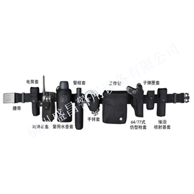 組件名稱:由黑色外腰帶、內(nèi)腰帶、斜肩帶、手銬套、通用型對講機套、強光手電套、警務(wù)工作包、警用水壺套、警棍套、64式仿型槍套(可選用槍型)、催淚噴射器套、64式彈夾套組成,除手槍套外,其他可單獨拆卸。