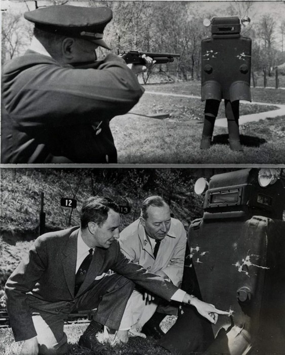 這些照片描繪了一位底特律警官使用大口徑霰彈槍對一件外貌相當獨特的防彈衣進行試射的場面。這件防彈衣看起來就像是來自1950年代的科幻小說一樣。從照片中可以看出,這名警官在極近的距離反復實施了多次射擊。
